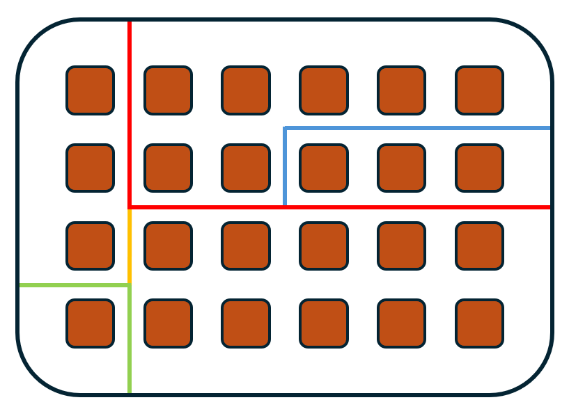 The picture above shows John's first attempt at this method, using a different color for each piece of rope. However after placing only a few pieces of rope according to the rules, he realizes he is wasting quite a bit of time cutting each distinct piece of rope and wonders if he could be using a better strategy which involves less cutting.